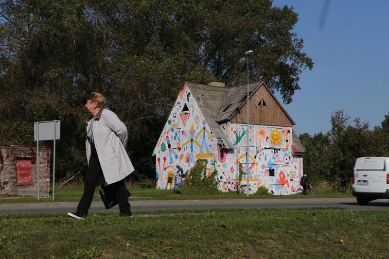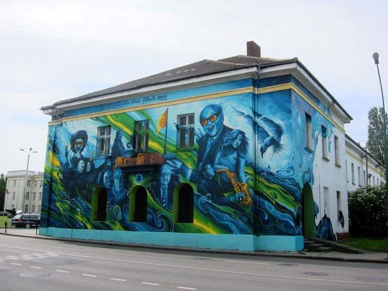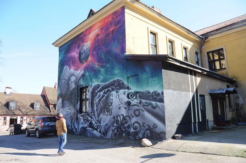 POKYTIS. Menininkas Seikon iš Gdansko vizualiai pakeitė KKKC Parodų rūmų fasadą Didžiojoje Vandens g. 2. Kūrinys sukurtas 2017 m. festivalio „Edit Klaipėda Street Art” metu. „Vakarų ekspreso“ archyvo nuotr.