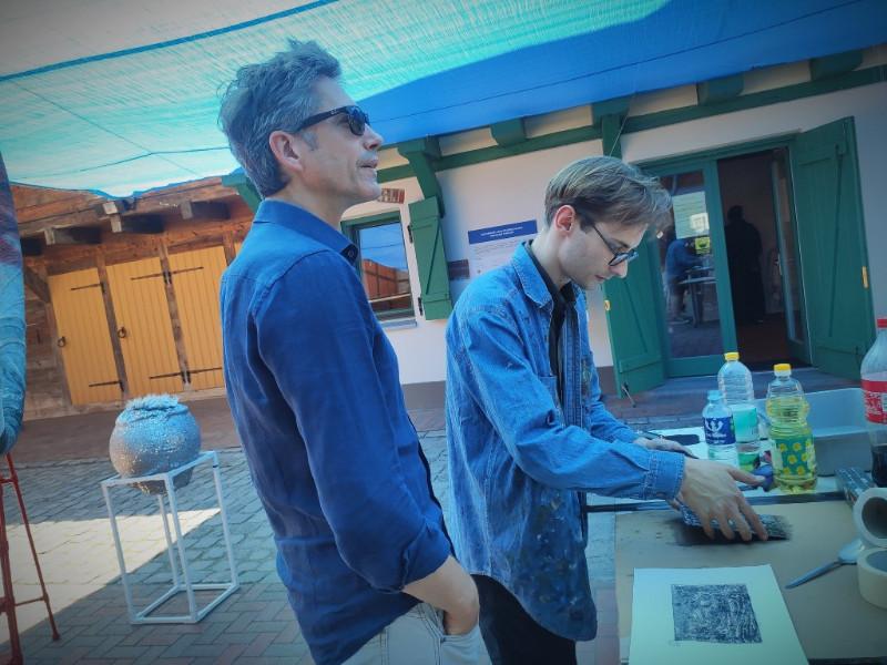 Kūrybinėse grafikos dirbtuvėse „Now Art. Atgimimas“ su menininku Evaldu Mikalauskiu. Agnės Tumšienės nuotr.