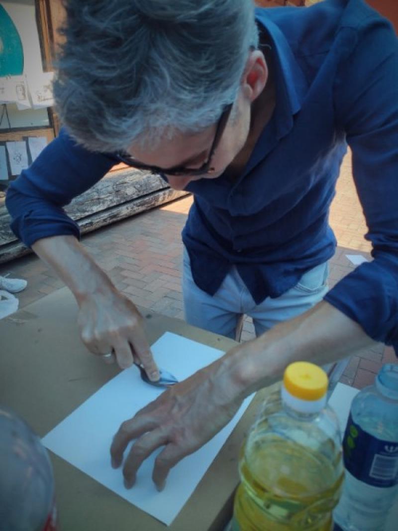 Prie projekto prisijungusi dar viena KKKC meno dirbtuvių rezidentė Toma Šlimaitė-Bubelienė dalyviams siūlė išmokti sausos adatos technikos. O kad svečiams būtų aiškiau, su kuo turės reikalų, vieną iš Meno kiemo langų Toma papuošė savo atspaudų paroda. Paklausta, ko jai pačiai, kaip kūrėjai, suteikė šios dirbtuvės, grafikė akcentavo galimybę kurti su skirtingų kartų menininkais: „Labai džiaugiuosi, kad į šias kūrybines dirbtuves atvyko jaunosios kartos menininkų. Klaipėdoje yra palyginti mažai grafikų, nes čia jų niekas neruošia, ir man asmeniškai tai – savotiškas atgimimas, nes susipažįstame su naujomis technikomis. Pavyzdžiui, net neįsivaizdavau, kad galima ėsdinti apvyniojus neorganinį plastiką folija ir pamerkus į kokakolą. Mūsų tikrai niekas to nemokė. Vyresniosios kartos menininkas E. Mikalauskis, turintis daug klasikinės grafikos technikų patirties, mielai dalijosi įvairiomis profesinėmis subtilybėmis. Labai įdomu pabendrauti, pasidalinti patirtimis. Mes vienas iš kito mokomės. Ir tai labai smagu”, – įspūdžiais dalijosi T. Šlimaitė-Bubelienė.