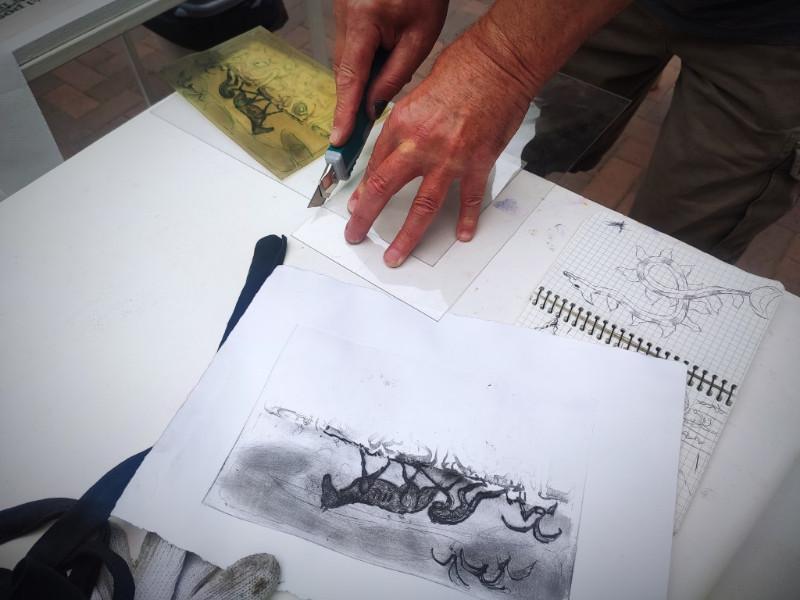 Jaunosios kartos grafikas Jonas Vaikšnoras, į Klaipėdą atvykęs iš Kauno, visas penkias dirbtuvių dienas dalyvius mokė virtuvinės litografijos, kuriai naudojami kokakola, aliejus ir actas. Iš kur menininkas išmoko šios keistos technikos?