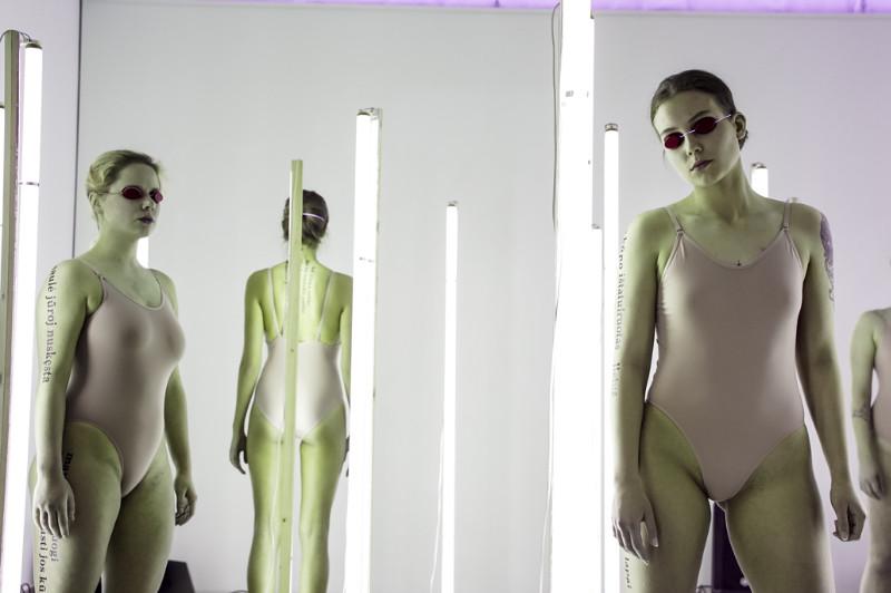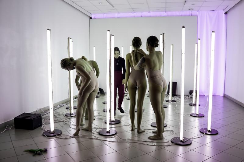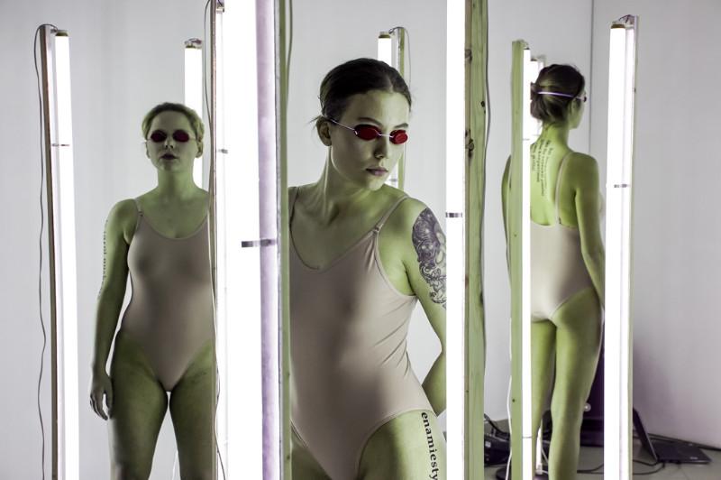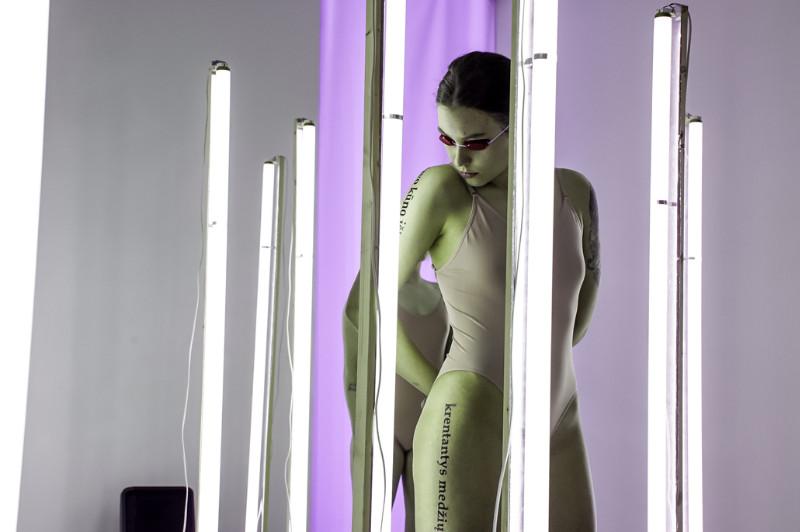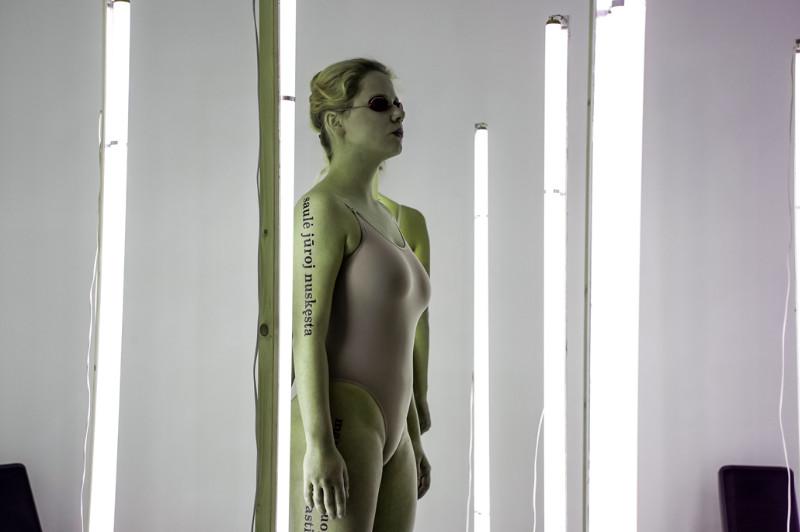Saulė Miežytė, „Melanin Print”, 2019 m. šviesų instaliacija / performansas. Soliariumo lempos; garsas, tekstai. Trukmė 15 min. Nerijaus Jankausko nuotr.