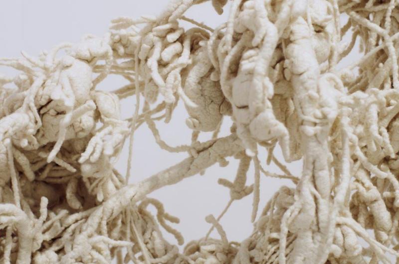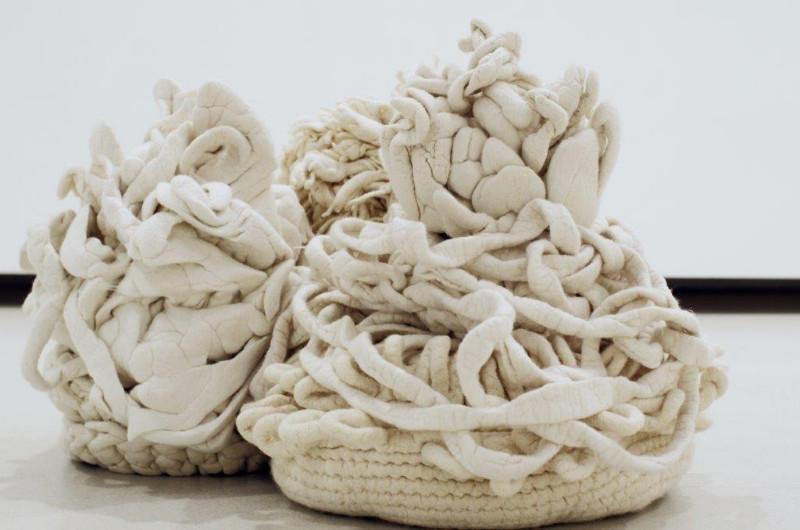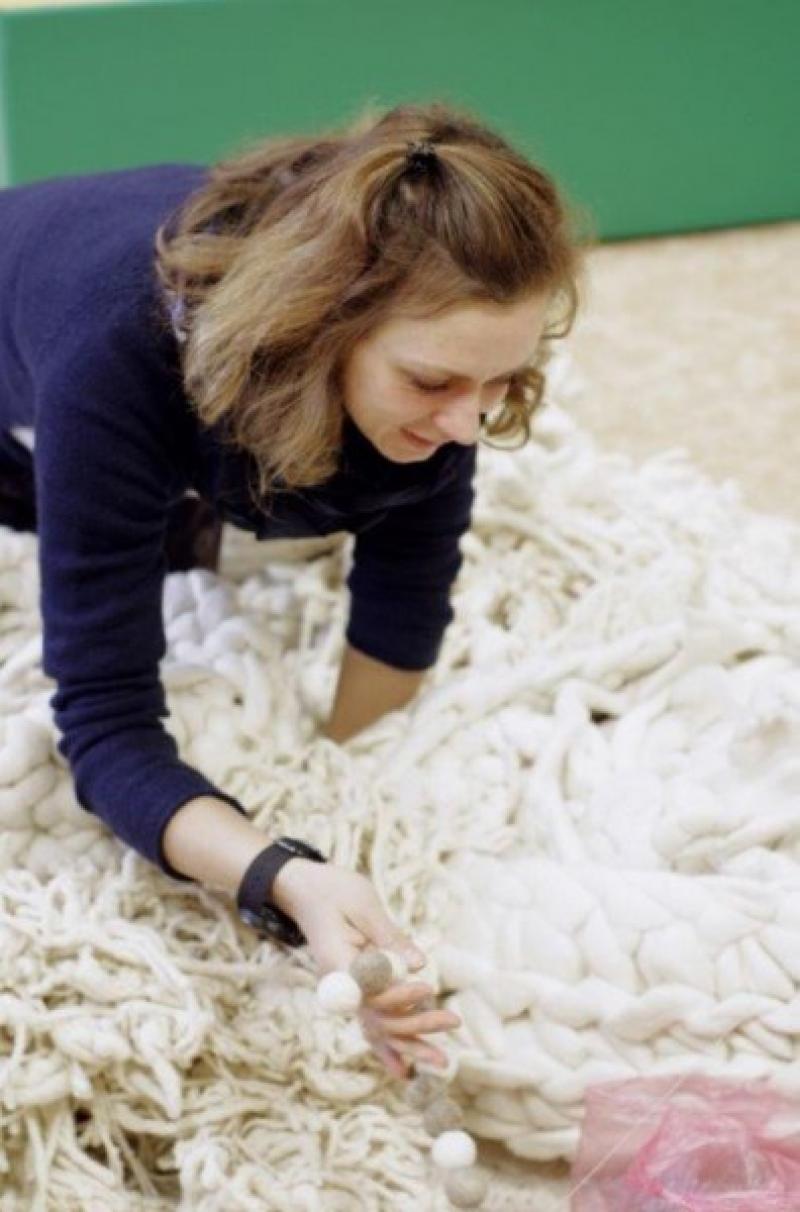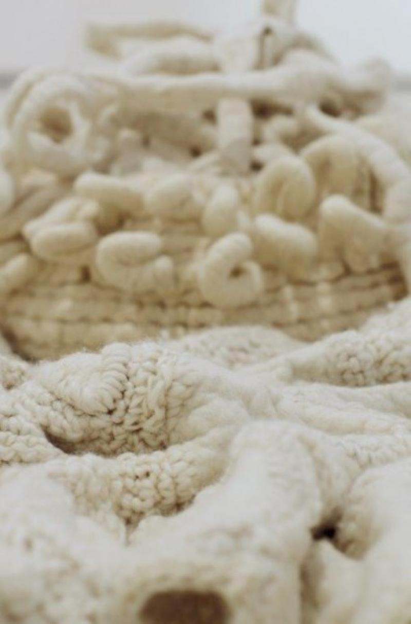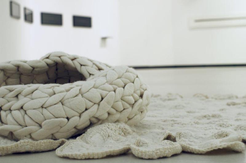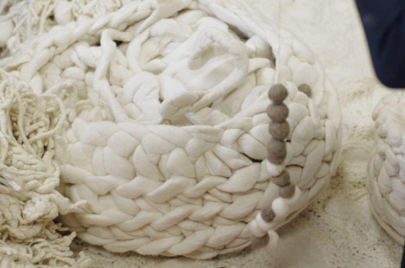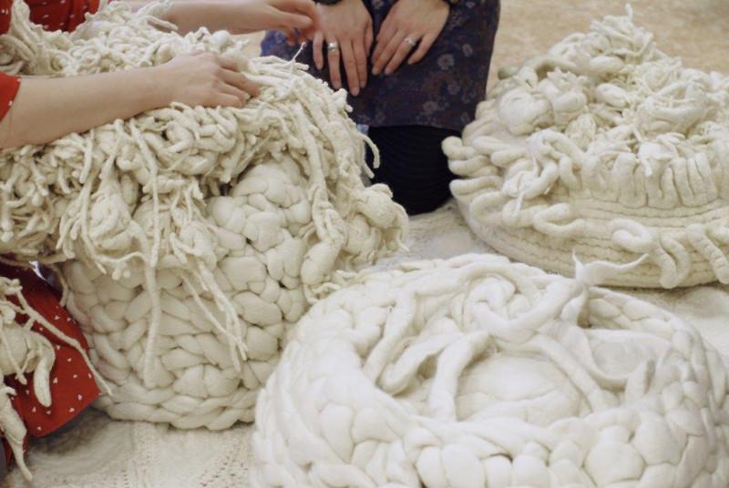 Lina: Mūsų pagrindinė priemonė yra natūrali nedažyta balta vilna. Iš jos sukūriau 11 įvairaus dydžio objektų, kuriuos konstruojant, perdėliojant, sukemšant vieną į kitą galima pasidaryti mažiau arba daugiau. Visus juos jungia didžiulis, daugiau kaip 2,5 m skersmens kilimas, veltas ir nertas kombinuotu būdu. Kiti objektai yra velti arba nerti, sujungti didesniais ir mažesniais segmentais. Pastebėjome, kad tie objektai, padėjus juos erdvėje, tampa beveik skulptūromis. Sunku pamatuoti – menas tai ar ne, tačiau jaučiame atsakomybę kurti estetiką.