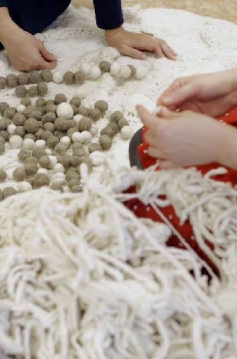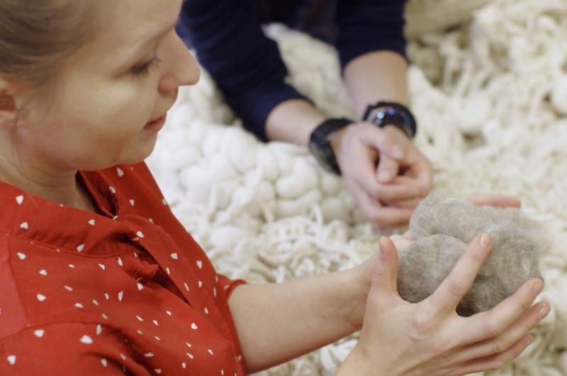 Inga: Pristatydamos projektą Nidoje, festivalyje „Senųjų amatų dienos”, pamatėme, kaip vilna veikia vaikus. Tėvai negalėjo jų nutempti nuo kilimo, o mažųjų fantazijai nebuvo ribų! Darbiniai vilnos karšiniai jiems virto ir krokodilu, ir šernu, vyko kažkokie gyvačių susitikimai… O vilnos kamuoliai vaikams buvo tikras atradimas!