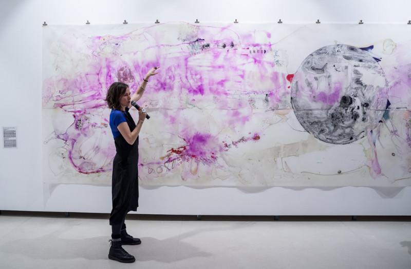 Parodos kuratorė Laima Kreivytė (kairėje) ir menininkė Ieva Martinaitytė-Mediodia (dešinėje priekyje) pristatant parodą „Ievos išvarymai“. Nerijaus Jankausko nuotr.