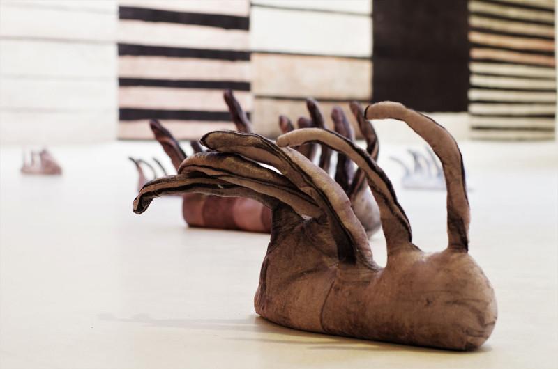 Tai delnai. Mamos delnai, jausmų delnai. Ir spalva tokia švelni, kad, atsistojus prie šios konstrukcijos, būtų pojūtis, tarsi mama tave apglėbia. Specialiai dariau faktūrą, kad norėtųsi liesti paviršių ir jis būtų nelygus, tarsi „išgyventas”. Vidinėje delnų pusėje yra labai daug monotipijos atspaudų sluoksnių. Norėjau išgauti ne ryškią spalvą, bet kad būtų daug posluoksnių, kad būtų išjausta, kad norėtųsi prieiti, pačiupinėti: kažin, kaip čia padaryta…