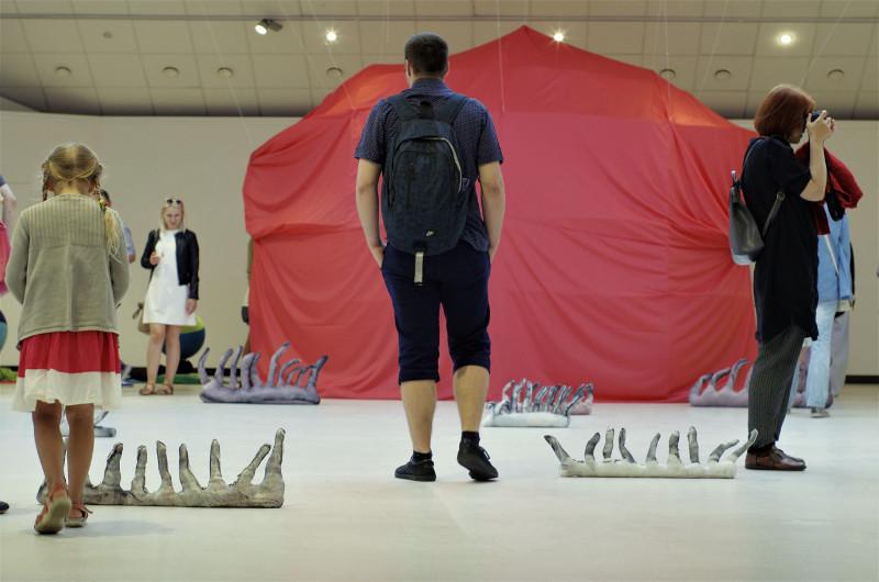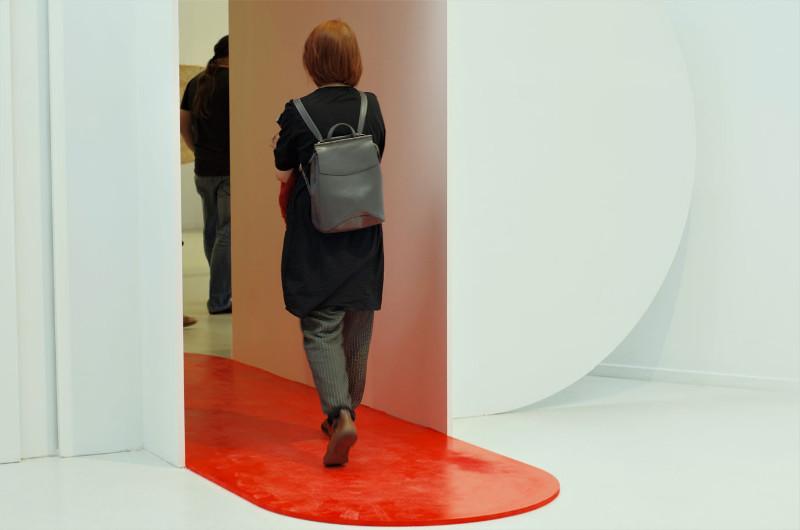 Paroda prasideda nuo konstrukcijos, pro kurią tarsi raudonuoju kilimu įeinama į salę. Tai durys į vaikystę, į pasaką?