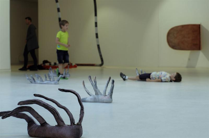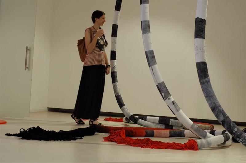Daugelį parodos objektų – sūpynes, kamuolius, gyvates – jau esu dariusi savo vaikui… Vienas didysis objektas buvo mano magistrinis darbas, žinoma, jis buvo kitoks – kraujotakos tema, panašių formų, bet buvo apklijuotas grafikos darbais. Kai reikėjo atnaujinti savo CV, peržiūrėjau visus darbus ir supratau, kad per penkerius metus nesukūriau nieko tokio, kas mane tenkintų. O kiekvienas menininkas, net ir moteris, turi ambicijų (kvatoja). Moteriai menininkei iš tikrųjų yra be galo sunku, nes laiko kūrybai turi kur kas mažiau: jai reikia dirbti, reikia vaiką, namus prižiūrėti. Motinystė nėra lengvas darbas. Kaip ir ta paroda. Tai pirmoji tokia didelė mano paroda, darbai labai įvairialypiai, ir dabar jau žinau, kad tokiai parodai surengti reikėjo suburti didesnę komandą, o aš viską stengiausi padaryti pati ir dėl to man buvo gana sudėtinga. Rengiant šią parodą viskas, kas galėjo blogo nutikti, – nutiko. Labai nesisekė su meistrais, kol pagaliau paprašiau Martyno Rimkaus („Medsiede”) pagalbos. Jau buvau susidūrusi su jo darbais, žinojau, kaip puikiai jis dirba, ir labai džiaugiuosi, kad jis nepabijojo iššūkių ir pagamino medinius objektus. Kūrybinius sumanymus įgyvendinti man padėjo Gerda Antanaitytė, Dainius Buika, Aleksandra Kondratjeva, patarimų negailėjo Irma Leščinskaitė. Sulaukiau labai daug pagalbos ir palaikymo iš visos savo šeimos – esu jiems be galo dėkinga! Dabar jau žinau, kad į komandą reikia kviesti išbandytus žmones.