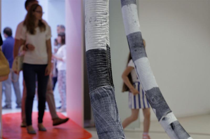 Aš jas vadinu žolytėmis, bet iš tikrųjų tai tarsi organuose esantys plaukeliai, kurie tave liečia, pavyzdžiui, kai kraujas teka. Būtų smagu, kad jų būtų daug, bet fiziškai nepajėgiau daugiau padaryti. Kai eini per salę, jie tave liečia. Gali juos kliudyti, gali paglostyti… Tai irgi yra grafika, spausta ant tekstilės. Pradinis sumanymas buvo tas žoles spausti ant popieriaus ir po to jį klijuoti ant plokštės. Bet kai pradėjau dirbti, atėjo išganinga mintis naudoti tekstilę.